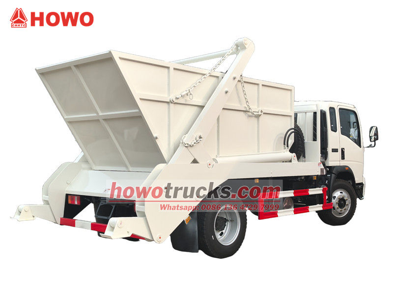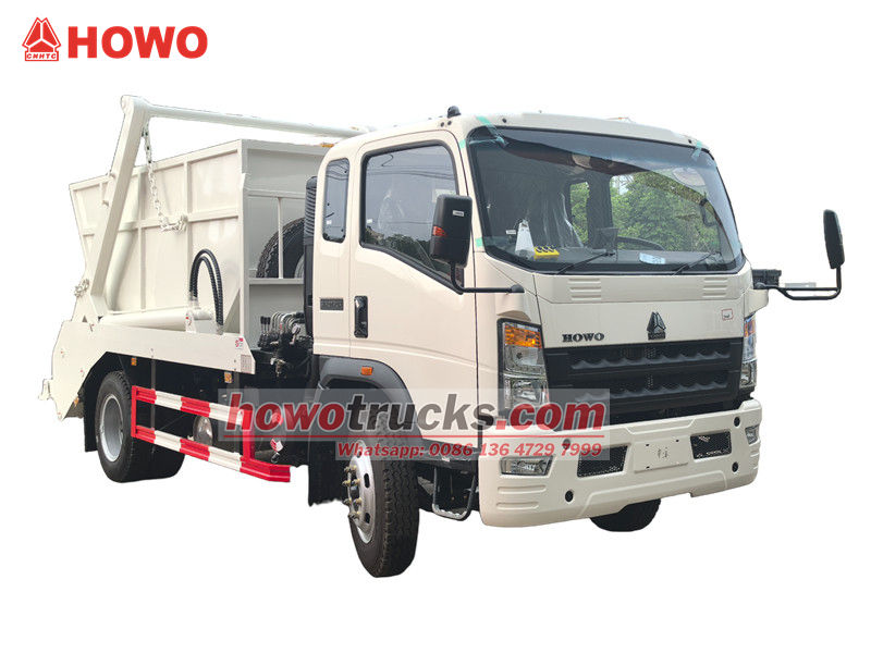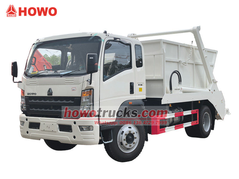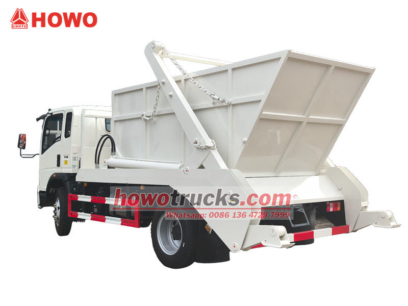 Camion à ordures HOWO 4x2 à bras oscillant et conduite à droite, également appelé camion à benne basculante HOWO, camion à déchets à benne amovible HOWO 4x2, camion à ordures HOWO 6 m³ à benne basculante, camion à déchets à benne basculante HOWO à conduite à droite, etc.
