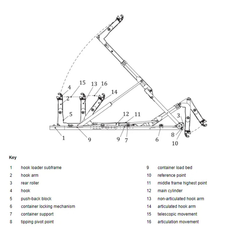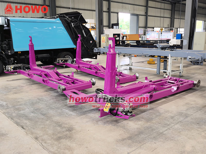 ●Récupérer la poubelle : Déployez le bras du crochet et alignez-le avec le crochet de la benne. Le système hydraulique serre le bras du crochet, soulevant lentement la benne du sol et la basculant sur le châssis du véhicule.