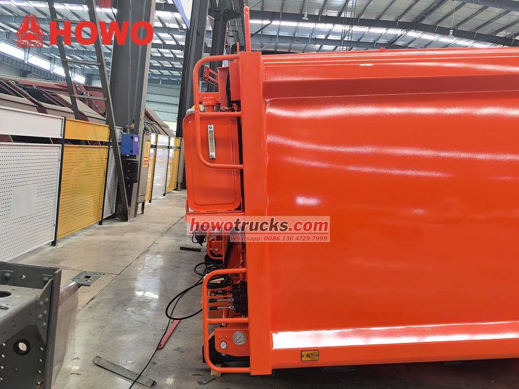 Le kit de benne à ordures HOWO supporte une pression verticale allant jusqu'à 12 tonnes lors des opérations de compression, prolongeant ainsi considérablement sa durée de vie. Le système de chargement utilise une conception hydraulique à plusieurs étages. Le système de glissement et de raclage est actionné par un vérin hydraulique Fujian Shanyou, utilisant une pompe Wanye unique pour une compression continue, garantissant un cycle de compression inférieur à 30 secondes. Le système hydraulique utilise une configuration redondante à double pompe : la pompe principale gère le levage du camion et l'ouverture/fermeture de la porte arrière, tandis que la pompe secondaire assure le mouvement du poussoir de compression. Cette répartition des tâches garantit un compactage rapide de 8 à 10 mètres cubes de déchets tout en évitant tout glissement involontaire lors du levage grâce à une valve d'équilibrage bidirectionnelle.