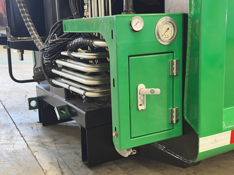 ●La partie supérieure du camion compacteur de déchets utilise un système hydraulique pour actionner le chargeur. Une fois les déchets chargés dans la trémie, la lame de poussée, actionnée par un vérin hydraulique, les achemine vers la chambre de compression.