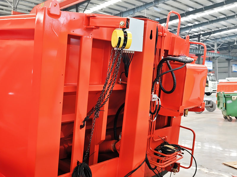 ●Vérins hydrauliques à plaque de poussée : Enfoncez la plaque de poussée à l'intérieur de la chambre pour compacter et pousser les déchets.