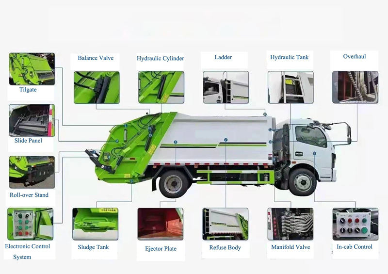 La superstructure du chargeur arrière Howo 10 CBM constitue le cœur du véhicule. Elle se compose principalement du conteneur à déchets, du chargeur, du mécanisme de poussée, du système hydraulique et du système de commande électronique. Son principe de fonctionnement repose sur le compactage des déchets dans le conteneur à l'aide d'une plaque de poussée hydraulique, ce qui réduit considérablement leur volume et améliore l'efficacité du transport. La superstructure est construite en acier haute résistance, garantissant une excellente étanchéité, empêchant les fuites et la propagation des odeurs.