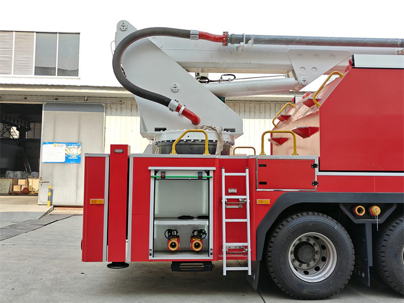 La partie pivotante est équipée d'une articulation centrale permettant une rotation à l'infini sur 360 degrés. HLe camion de pompiers Owo, doté d'une tourelle extensible à grande portée, est équipé d'une pompe à incendie à haut débit et d'un canon à eau. La cuve et le circuit d'eau sont entièrement fabriqués en acier inoxydable de haute qualité et en alliage d'aluminium haute résistance. Le système hydraulique utilise une pompe haute performance et un système de commande électro-hydraulique proportionnel. Le système électrique repose sur une technologie de communication CAN bus éprouvée et fiable, et permet une gestion centralisée multipoint.