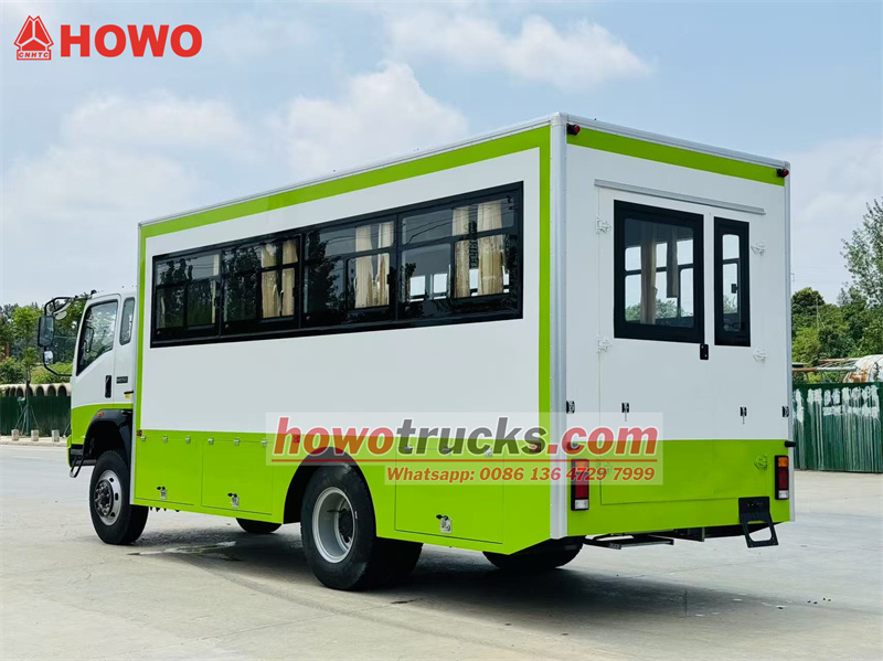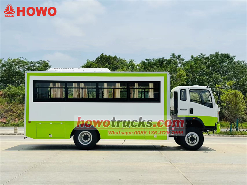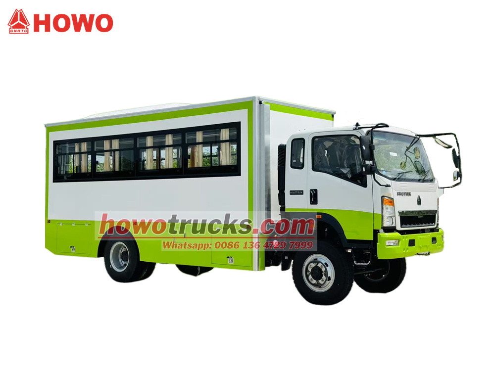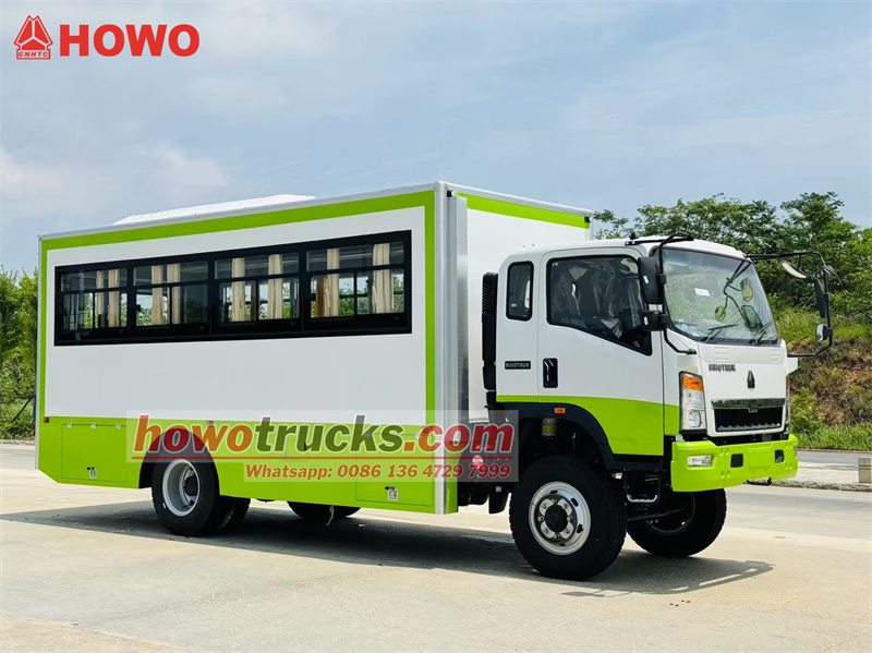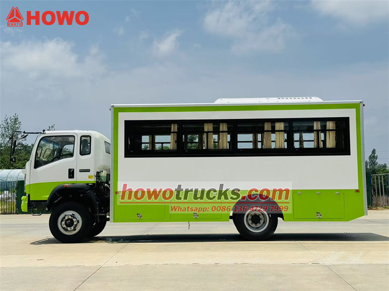 Le camion de transport de troupes HOWO 4x4 est dérivé du châssis du camion léger HOWO à quatre roues motrices. Il est doté d'une cabine semi-rigide de 2 080 rangées, d'un empattement de 3 800 mm et est équipé d'un moteur Yuchai YC4E140-33 et d'une boîte de vitesses WLY6TS55. La partie supérieure est un compartiment de transport de troupes comprenant 22 places assises, des vitres transparentes et des rideaux latéraux, ainsi qu'un hayon vitré pour faciliter l'entrée et la sortie. Des porte-bagages sont installés au-dessus des sièges et disposés de part et d'autre du compartiment. Ce dernier est climatisé et éclairé, et des coffres à outils sont installés sur les parois inférieures.