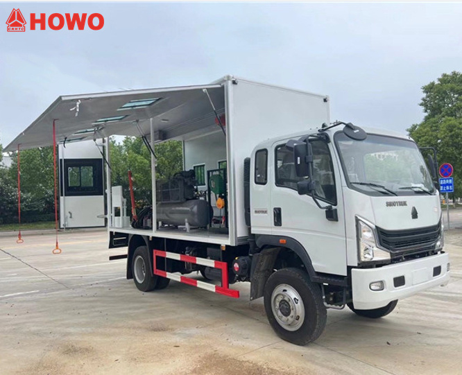 4200LeCamion cargo de service mobile HOWO 4x4 Ce véhicule d'intervention intégré est conçu spécifiquement pour les environnements de travail extérieurs complexes. Son châssis à quatre roues motrices lui confère une puissance exceptionnelle. Son châssis supérieur ergonomique de type aile est équipé d'une grue hydraulique, d'un groupe électrogène diesel, d'un compresseur d'air, d'un poste de soudage au gaz et d'un distributeur de carburant, permettant ainsi des opérations de maintenance complètes, incluant le levage d'équipements, le soudage et l'alimentation électrique. Il peut intervenir rapidement sur site et démarrer ses opérations sans délai.
