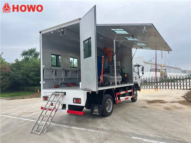 Le véhicule d'entretien mobile HOWO 4x4 présente les configurations suivantes : cabine HOWO 1880 à une rangée, empattement de 3 360 mm, moteur Weichai WP3NQ140E50, boîte de vitesses WLY6G120, fourgon de 4 200 × 2 100 × 2 000 mm, panneau latéral droit à envergure variable avec support télescopique, vitres, plaque de fond en alliage d'aluminium, éclairage intérieur et outils d'entretien comprenant un compresseur d'air, un générateur, des étagères sur mesure, une grue hydraulique à bras repliable, une armoire à outils et un système de ravitaillement.machine avec pistolet de ravitaillement et enrouleur de tuyau d'huile de 10 mètres, échelle, bouteilles d'oxygène, bouteilles d'acétylène, machines de découpe au gaz et de soudage hydraulique, uneMeuleuse à disque manuelle, deux extincteurs, etc.