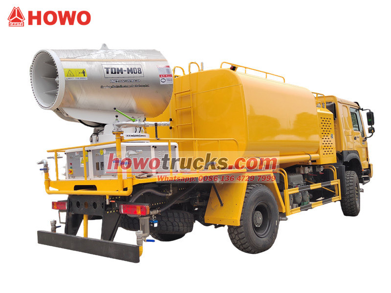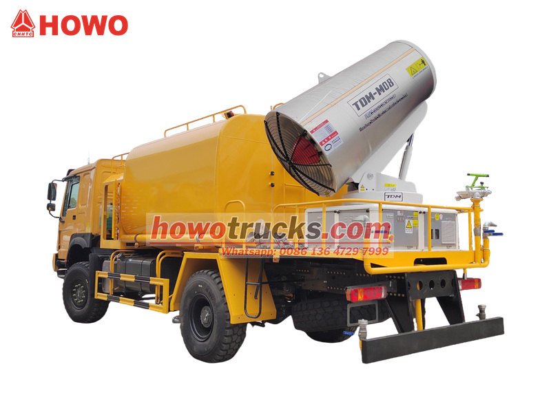 Le camion canon à eau HOWO 4×4 est construit sur le châssis à quatre roues motrices HOWO et équipé d'un moteur de 300 ch et d'une transmission intégrale, offrant des performances exceptionnelles sur les terrains les plus difficiles. Doté d'un canon à eau à très longue portée de 80 mètres et de 90 buses, il projette un fin brouillard d'eau (20-200 µm) sur une surface maximale de 20 000 m². Grâce à sa cuve à eau de grande capacité de 10 000 litres et à son système de pulvérisation haute pression, il est particulièrement efficace pour la réduction de la poussière sur les routes et les chantiers, ainsi que pour la pulvérisation agricole. Il est notamment adapté au contrôle de la poussière dans les zones minières, les ports, les zones urbaines et autres secteurs d'activité.