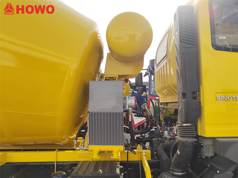 Le camion malaxeur à béton HOWO de 5 m³ est basé sur le châssis HOWO 2080 à cabine allongée et demi, pour un poids total de 16 tonnes et un empattement de 3 800 mm. Il est équipé d'un moteur SINOTRUK MC05.18-40 de 180 chevaux et d'une boîte de vitesses HW90510C à 10 rapports. La cuve de malaxage supérieure, d'une capacité de 5 m³, est fabriquée en acier au manganèse Q355. L'épaisseur de la cuve est de 4 mm et celle du fond de 6 mm. Le camion est équipé d'un réducteur, d'une pompe et d'un moteur hydrauliques, d'un radiateur, d'un boîtier de commande pneumatique, d'un réservoir d'eau de 400 litres, d'une alimentation en eau sous pression d'air, de poignées de commande ambidextres à l'arrière, d'un système de relevage et d'un faible taux de résidus.