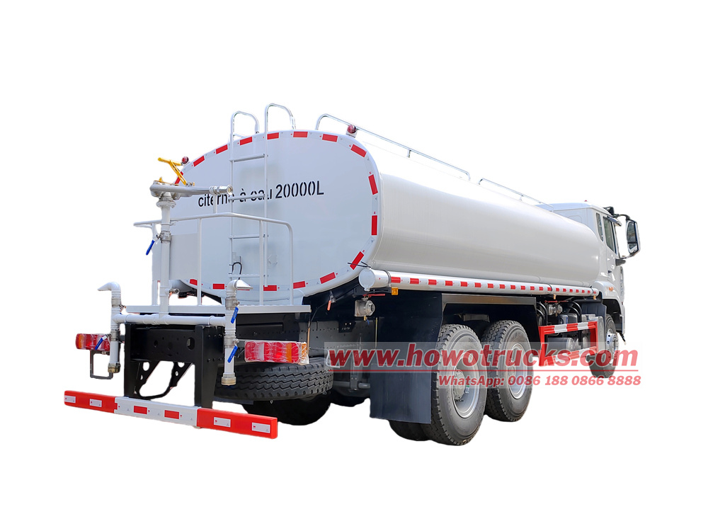 16000*2The HOWO diesel delivery tanker truck for Congo, centered around the HOWO NX371 chassis and equipped with a Weichai WD615.47 engine, is specifically designed for scenarios such as road cleaning and green irrigation. With its large 20cbm water tank capacity, equipped with a high-flow 80QZF-60/90 sprinkler pump and various nozzles including front flushing, rear side spraying, rear sprinkling, and high-pressure water cannon, covering scenarios such as road cleaning, green irrigation, and emergency firefighting