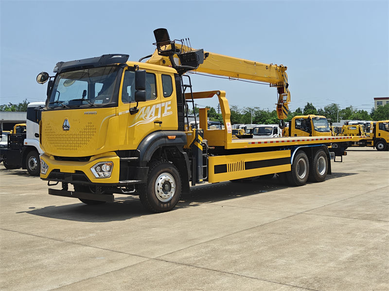13000*2Ce Camion de remorquage à plateau Howo avec grue de 8 tonnes Ce camion spécial polyvalent et bien conçu est équipé d'un moteur diesel Yuchai Engine de marque chinoise, d'une puissance de 260 ch, capable de répondre à divers besoins professionnels. La nouvelle cabine de luxe M9 peut accueillir trois personnes et est climatisée, offrant ainsi un environnement de conduite confortable aux conducteurs et aux opérateurs. La grue est dotée d'une flèche télescopique d'une capacité de levage maximale de 8 000 kg, d'une rotation complète à 360° et d'une hauteur de levage maximale de 16,5 m.