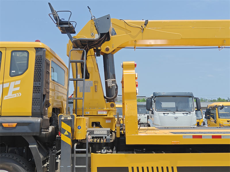 Ce camion de dépannage plateau Howo avec grue de 8 tonnes est un véhicule spécial polyvalent et bien conçu. Équipé d'un moteur diesel Yuchai de 260 ch (marque chinoise), il répond à divers besoins professionnels. La nouvelle cabine de luxe M9, climatisée et pouvant accueillir trois personnes, offre un confort optimal aux conducteurs et opérateurs. La grue à flèche télescopique, d'une capacité de levage maximale de 8 000 kg, pivote à 360° et atteint une hauteur de levage maximale de 16,5 m.