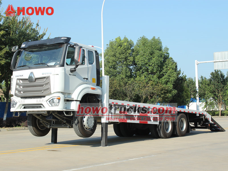 Le camion auto-chargeur HOWO NX est un véhicule professionnel conçu spécifiquement pour le transport d'engins de chantier de grande taille. Monté sur un châssis HOWO 6×4, il est propulsé par un moteur Weichai haute pression à rampe commune de 400 ch, offrant des performances robustes, un rendement élevé et le respect de l'environnement. Le véhicule est équipé d'une plateforme antidérapante de 8 600 × 2 500 mm, de deux stabilisateurs hydrauliques avant de 20 tonnes et d'un treuil hydraulique de 4 tonnes, formant un système de chargement et de déchargement sûr et fiable qui répond parfaitement aux besoins de transport et d'exploitation sur chantier des pelles hydrauliques et autres équipements lourds.