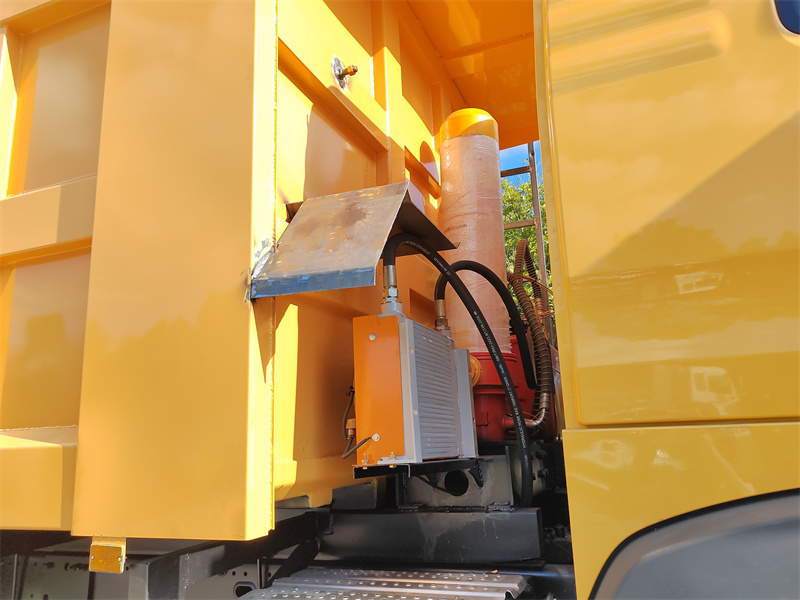 La déneigeuse multifonction HOWO TX350 6x4 est basée sur un châssis Sinotruk HOWO TX350 6x4 modifié, avec un empattement de 4 625 + 1 350 mm. Elle est équipée d'un moteur Sinotruk MC07H.35-60 et d'une boîte de vitesses HW13709XST. À l'avant, une brosse de déneigement MT80-330XSA offre une largeur de balayage de 3 à 3,3 mètres. Cette brosse, d'un diamètre de 800 mm, est entraînée par un moteur hydraulique. Un épandeur de sel de déneigement de 10 m³ est placé dans la benne arrière en acier au carbone, et le sel est acheminé par une vis sans fin. La largeur d'épandage est réglable de 2 à 12 mètres, et le débit (densité) est de 20 à 150 g/m².²La trémie est également équipée d'un filtre sur le dessus, d'un cône dissipateur d'énergie à l'intérieur, d'une alarme de niveau bas de matériau, d'une lampe de travail, d'un voyant lumineux fléché et d'une échelle à l'arrière.