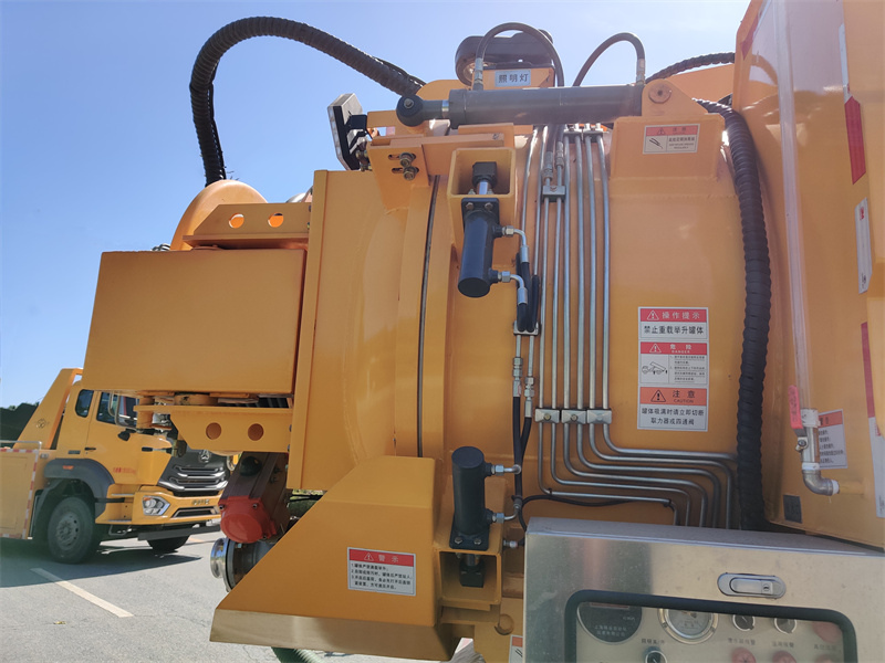 1. Système d'aspiration sous vide : Une pompe à vide Jurop PVT400 génère une dépression qui est ensuite aspirée dans une cuve en acier au carbone de 6,7 m³ via un bras d'aspiration. Une soupape de trop-plein, installée sur le dessus de la cuve, déclenche automatiquement une alarme de débordement et ferme l'orifice d'aspiration pour empêcher tout reflux. Le bras d'aspiration est réglable hydrauliquement en hauteur, en profondeur et en rotation afin de s'adapter à différentes positions de travail.