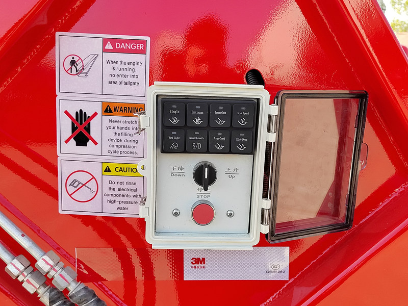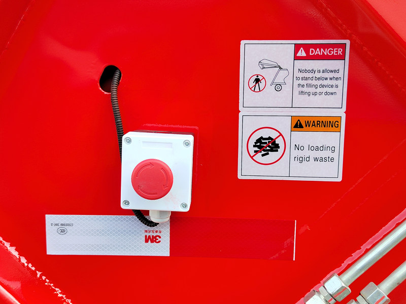 ►Un bouton de frein d'urgence spécialement conçu permet d'arrêter le mécanisme de compactage des déchets dans n'importe quel état ou position, assurant ainsi la sécurité du personnel et des équipements.