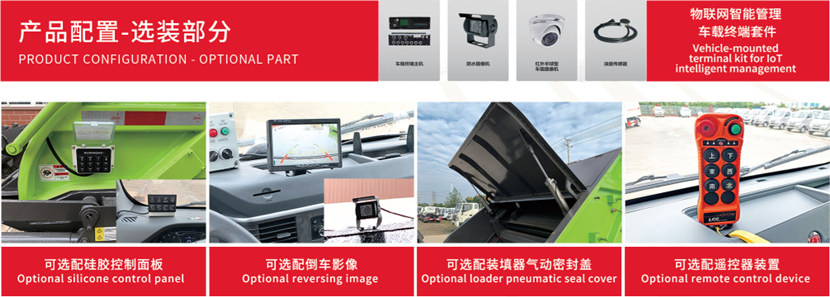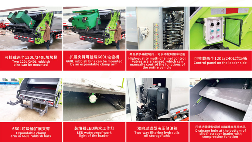 ►Doté de mécanismes d'inclinaison adaptés aux conteneurs carrés et ronds, et d'un dispositif à godet pour la collecte des déchets en vrac, les utilisateurs peuvent choisir différents mécanismes de collecte en fonction des différentes méthodes de collecte des déchets.
