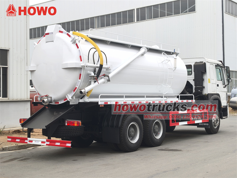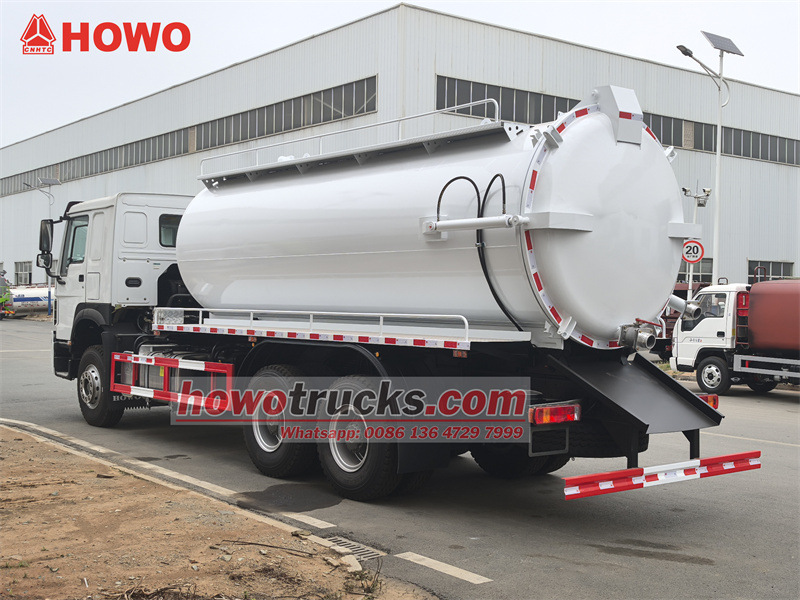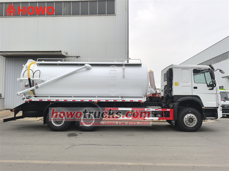 Le camion d'aspiration des eaux usées HOWO 6x4 de 15 m³ est basé sur le châssis-cabine HOWO HW76. Son empattement est de 4 600 + 1 350 mm. Il est équipé d'un moteur Weichai WP10.340E22 et d'une boîte de vitesses Sinotruk HW19710 à 10 rapports. La cuve à eaux usées de 15 m³ est en acier au carbone de 5 mm d'épaisseur. La cuve est relevable et le hayon est ouvrable. Le véhicule est équipé d'une pompe à vide Jurop PN106D d'un débit de 11 000 L/min. Il dispose également d'un tube de visite, d'une échelle, d'une vanne de vidange sur le hayon et d'un levier de commande hydraulique manuel côté conducteur (pour l'ouverture/fermeture du hayon et le relevage/l'abaissement de la cuve).